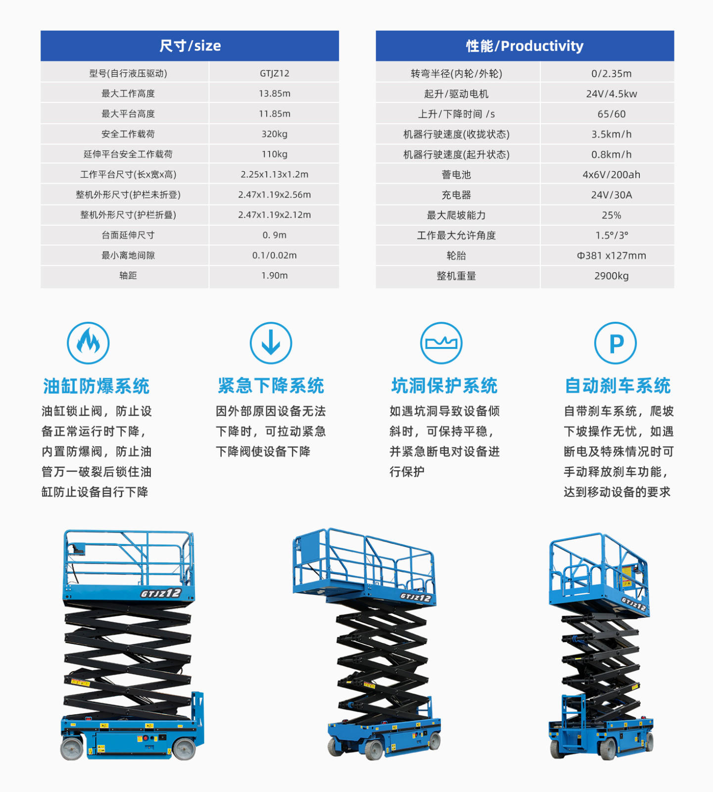 工作高度11.85-13.85m,平台承载能力320kg,爬坡能力25%,移动灵活,升降平稳,操作简单,广泛应用于厂房建设,设备维修,建筑保养。